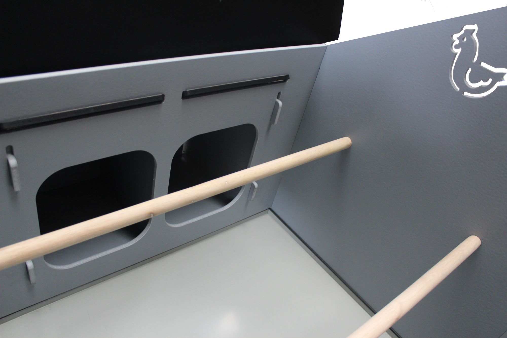 Ventilación Superior Gracias al sistema de ventilación superior, se evita la condensación dentro de la caseta. Esto crea un ambiente fresco y saludable para las gallinas.